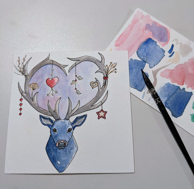 Carte carrée double avec intérieur vierge, représentant un cerf et ses jolis bois décorés de cœurs, fleurs sauvages et autre décoration bohème. Aquarelle originale peinte par mes soins et tirée sur papier d'art pour un cadeau unique, artisanal et local à tarif abordable.