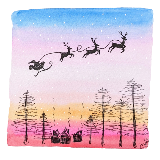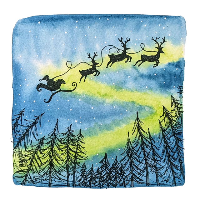 Carte carrée double à offrir à vos proches pour toute occasion, illustration originale à l'aquarelle originale par mes soins, reproduite en triage d'art pour une qualité optimale. 2 motifs au choix de traineau du père Noël, avec ciel dans les tons roses ou aurore boréale.