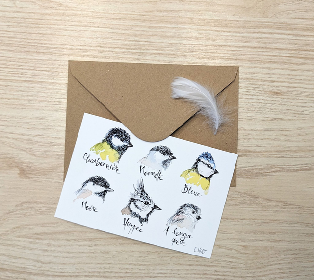 Cartes issues de mes créations originales, représentant diverses mésanges : bleue, charbonnière, nonnette, huppée...