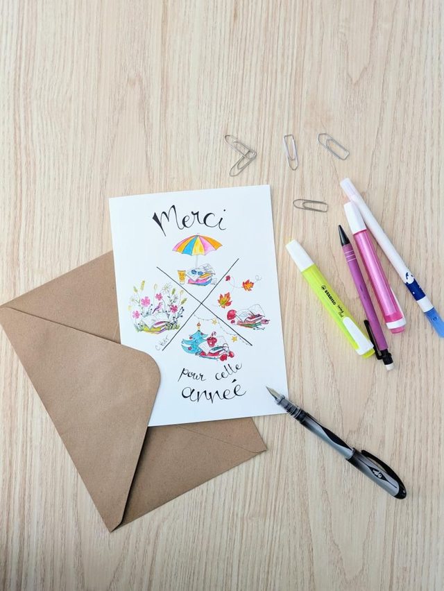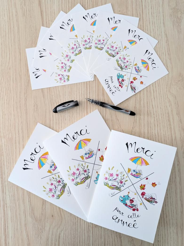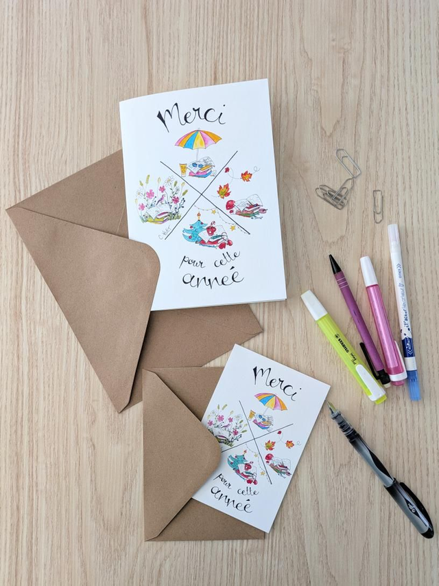 Voici les cartes créées tout spécialement pour l'occasion ! Un motif représentant les 4 saisons de façon colorée, de la rentrée de septembre aux vacances d'été, pour dire merci à celui ou celle qui a accompagné les enfants toute l'année pour les aider à grandir.