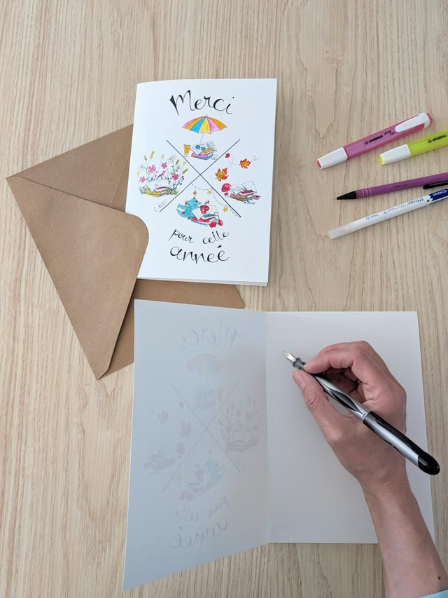 Disponible en grandes cartes A4 plié en 2 pour que toute la classe puisse signer, ou en carte postale pour un cadeau plus intime.