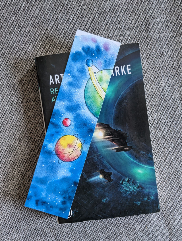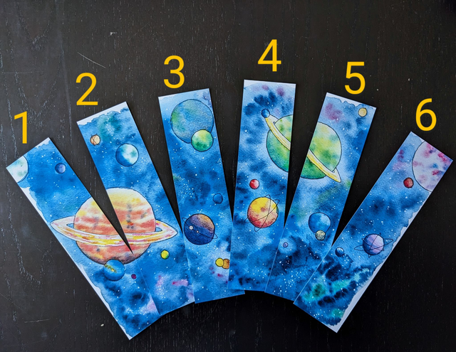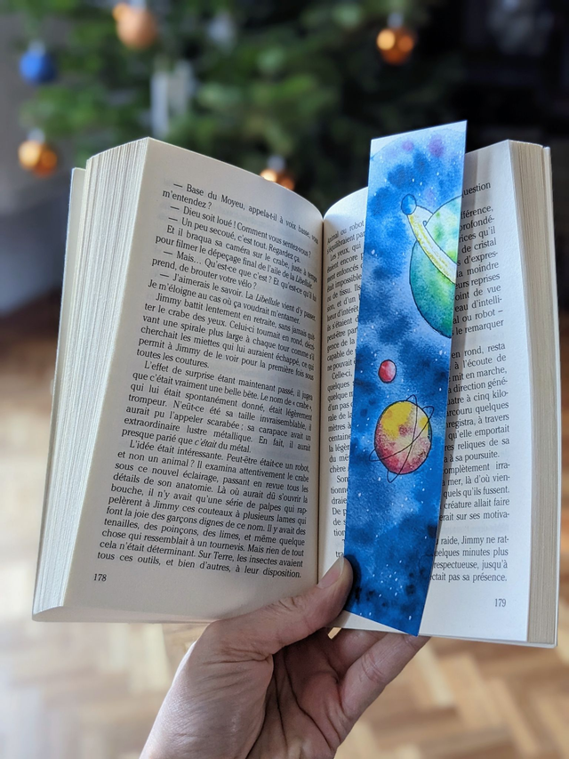 Marque-page représentant l'espace, des planètes colorées, des étoiles et des galaxies, illustration originale créée à l'aquarelle par mes soins et reproduite sur papier épais, pour faire plaisir aux enfants et adultes.