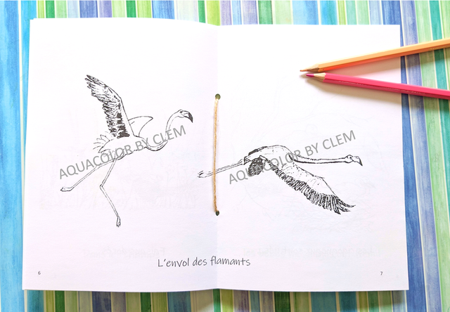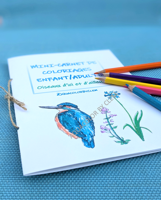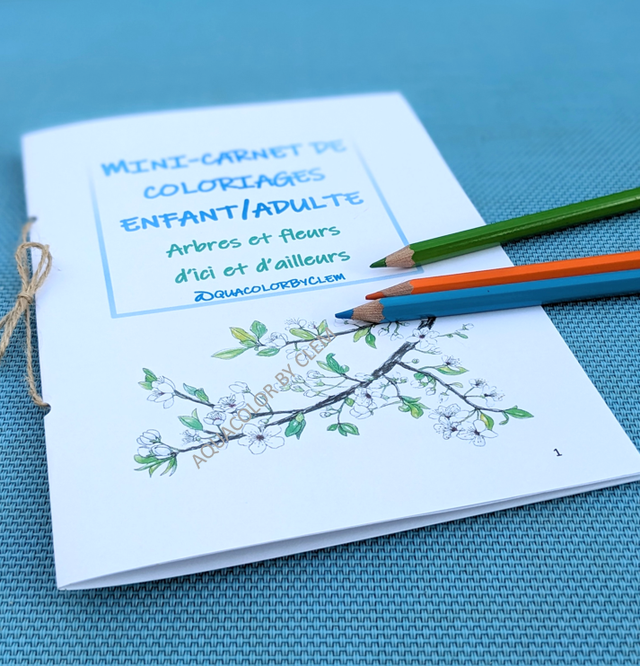 Mini-cahier de 8 coloriages A5 + un A4, reliés par une jolie ficelle naturelle et protégés par une couverture épaisse illustrée par mes soins.