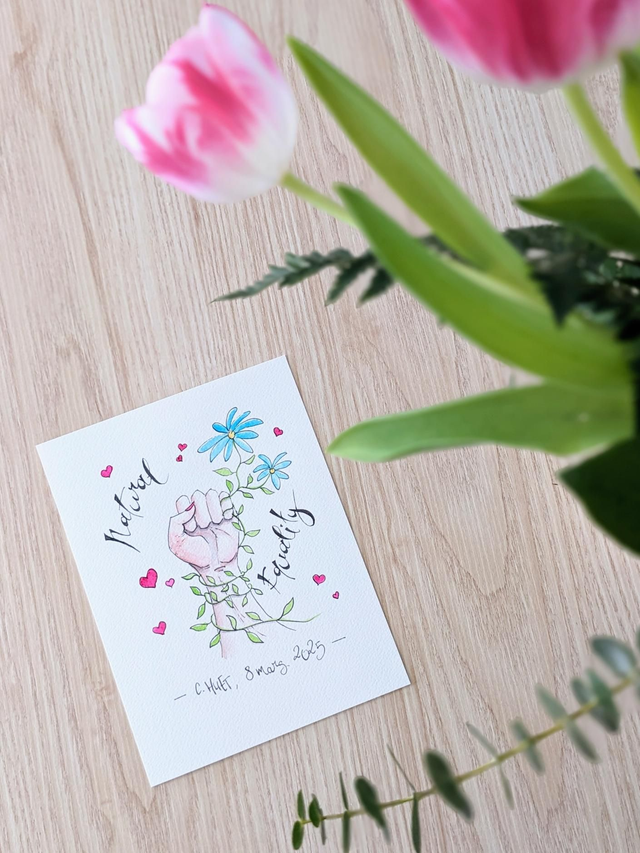 Tableau à la plume et à l'aquarelle, représentant le point levé d'une femme entremêlé de végétation, symbolisant la lutte pour l'égalité, dans la respect de tous les hommes et tout le vivant. Dans les couleurs pastels qui reflètent la nature et l'optimisme !