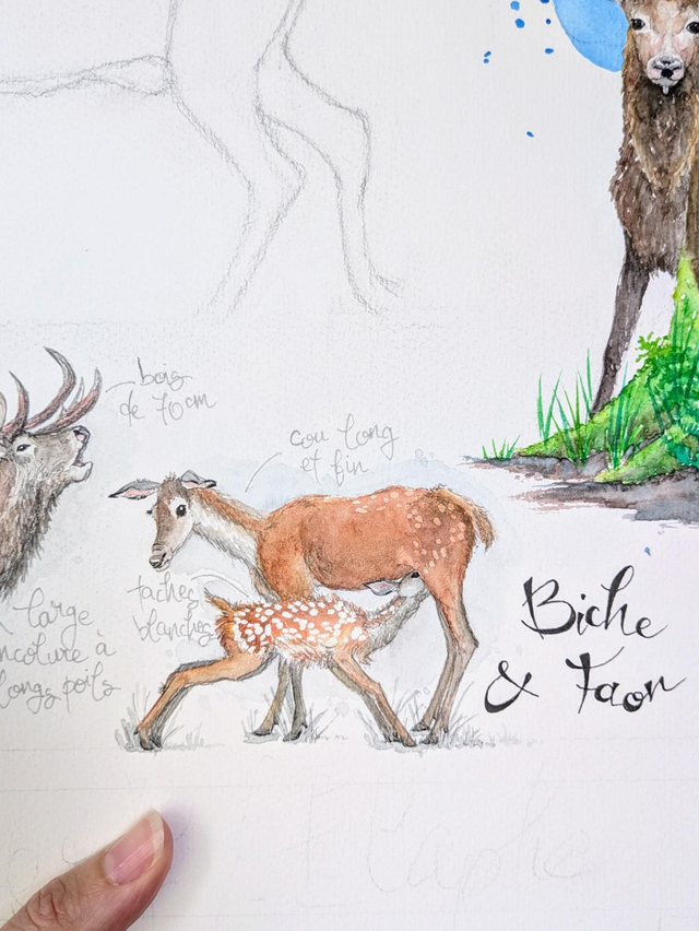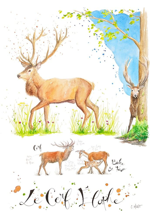 Planche naturaliste moderne cerf élaphe à l'aquarelle
