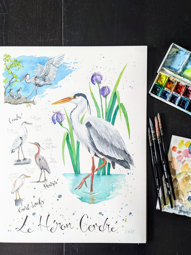 Planche naturaliste moderne héron cendré à l'aquarelle