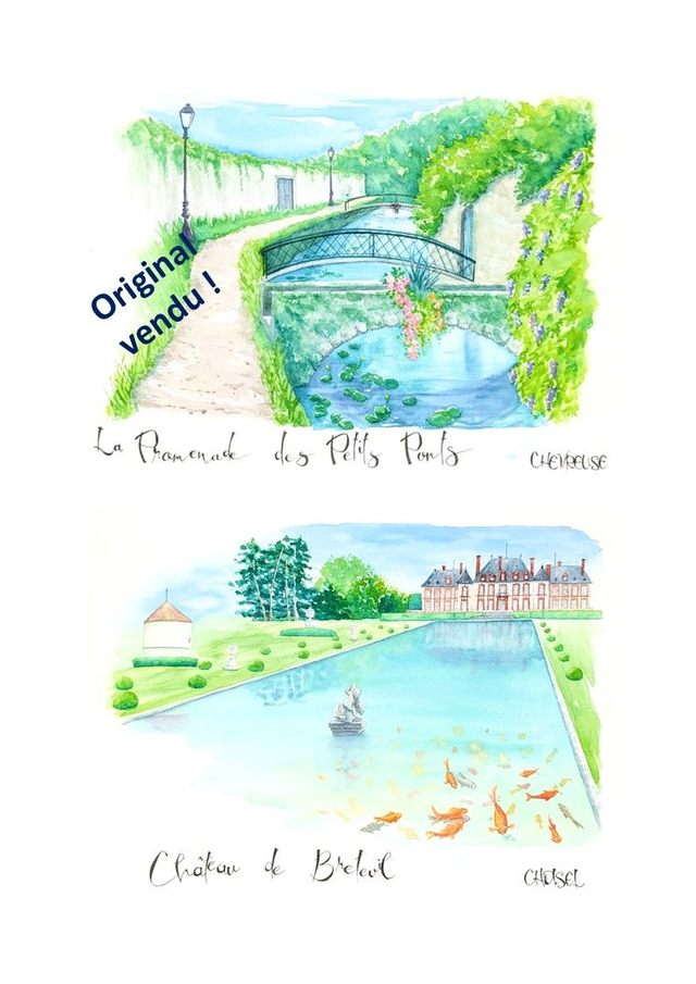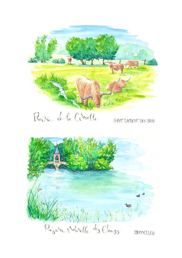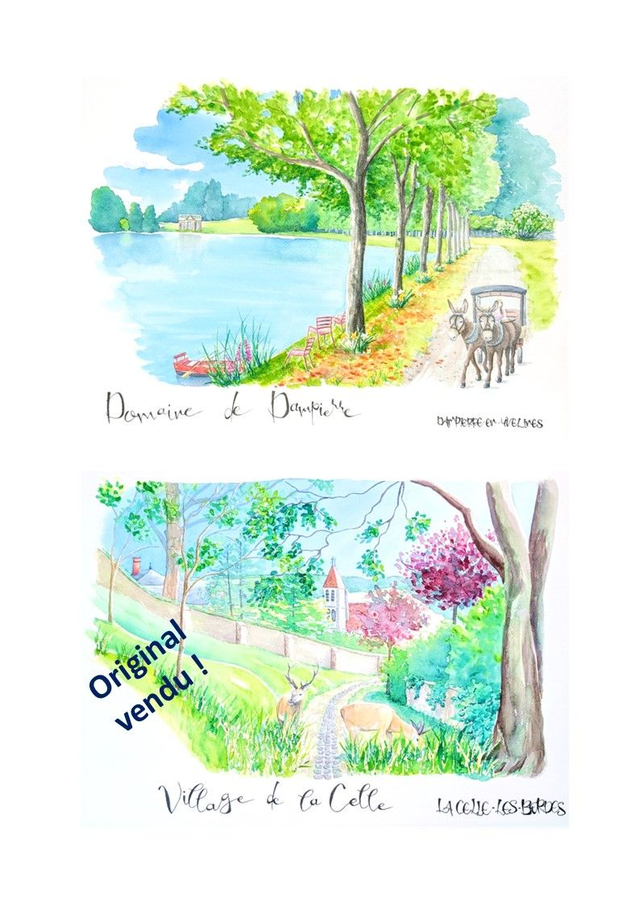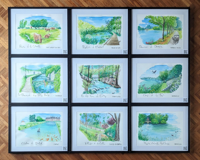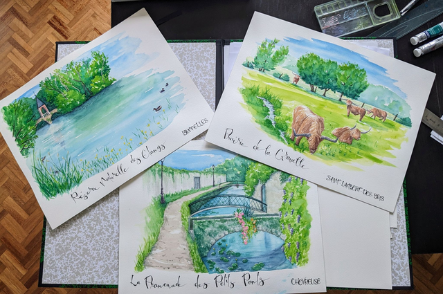 Tableaux à l'aquarelle des paysages naturels de la Vallée de Chevreuse, tel un carnet de voyage local, en format 30*40cm, exposés plusieurs fois en local.