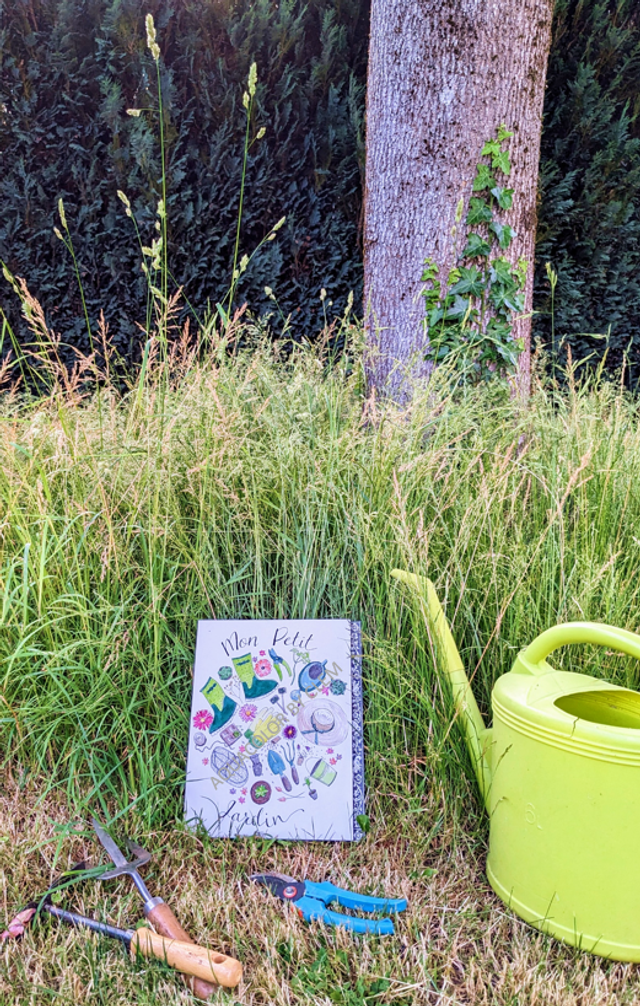 Il représente les accessoires et outils indispensables du jardinier, dans des couleurs vives et joyeuses.