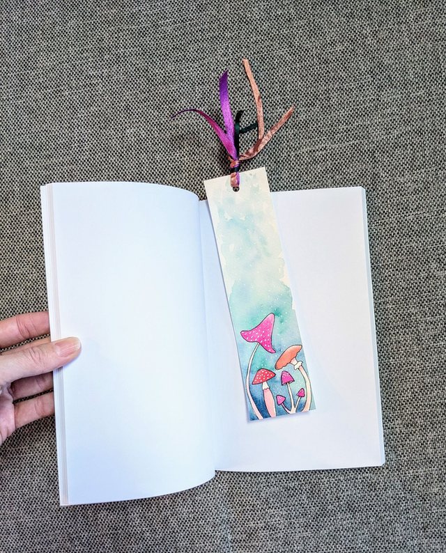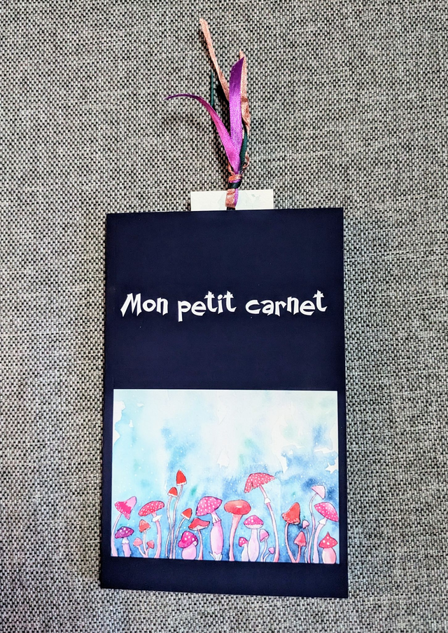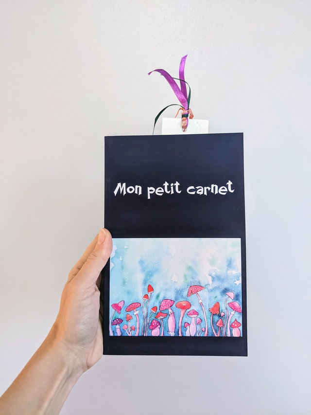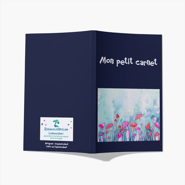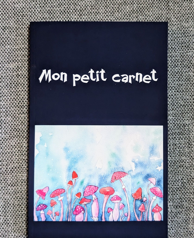 Voici un carnet de 80 pages blanches, avec couverture bleu foncé et illustration de champignons mignons roses dans un décor onirique de forêt enchantée, illustration originale créée à l'aquarelle par mes soins.