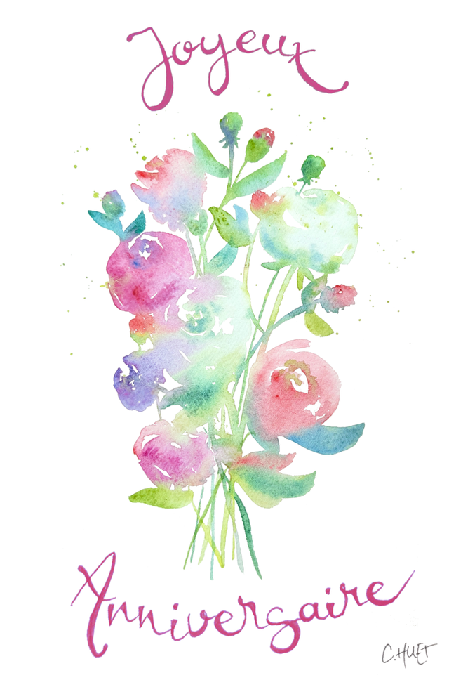 Carte postale marquée "Joyeux anniversaire" et décorée de jolies fleurs aquarellées ! Disponible en divers motifs floraux de plusieurs couleurs, pour faire plaisir à tous !