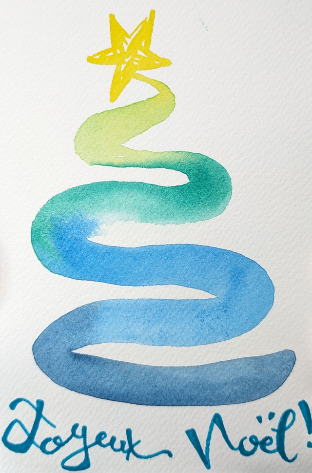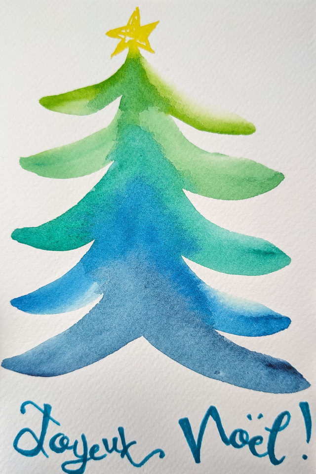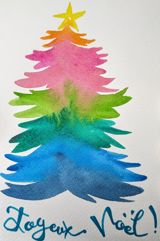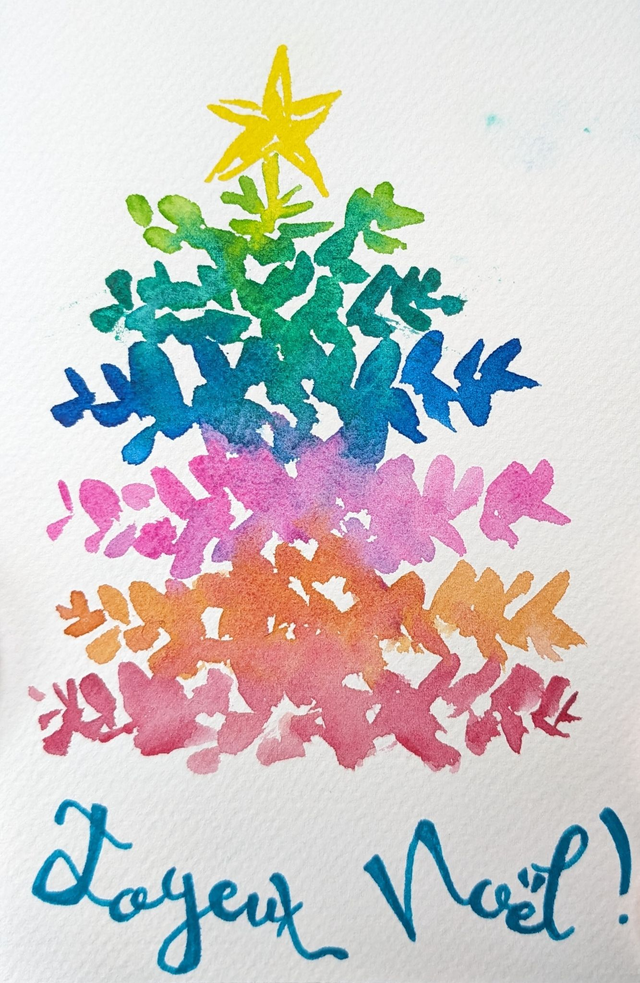Carte Joyeux Noël au sapin multicolore, aquarelle originale peinte par mes soins au format 10x15 puis tirée sur papier d'art, pour offrir à vos proches un cadeau artisanal 100% fait main en France !
