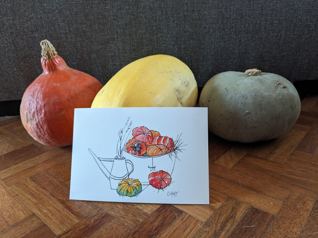 Réchauffez les cœurs et votre déco avec ces petites cartes représentant des courges dans diverses variations d'orange, accompagnées d'accessoires de jardinage anciens dans un décor campagnard. Reproduction d'une œuvre originale à l'aquarelle et fineliner créée et peinte par mes soins, avec tout mon amour pour les courges diverses et variées, du potimarron à la bleue de Hongrie, en passant par la spaghetti ou la butternut !