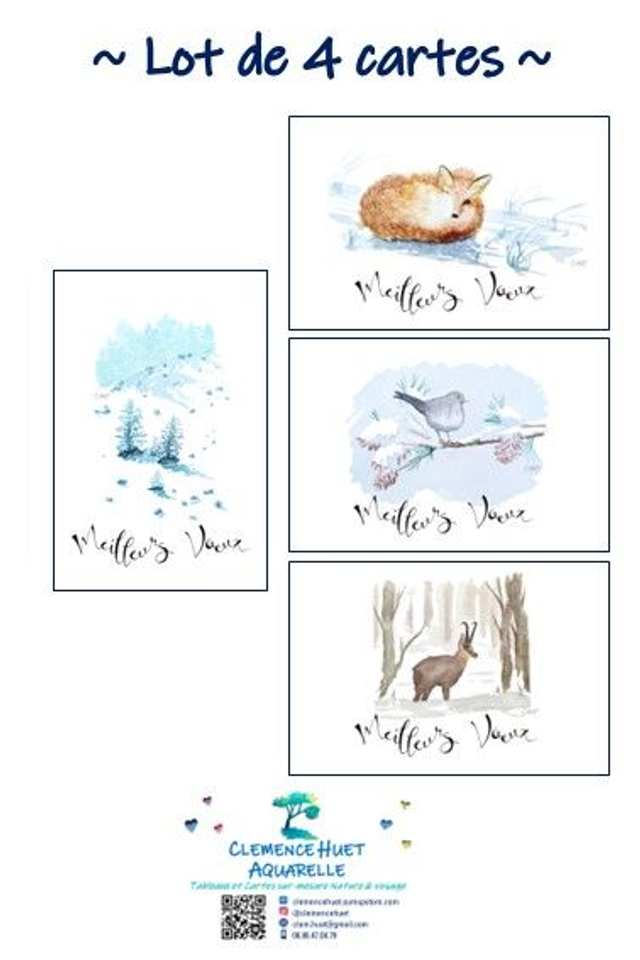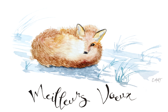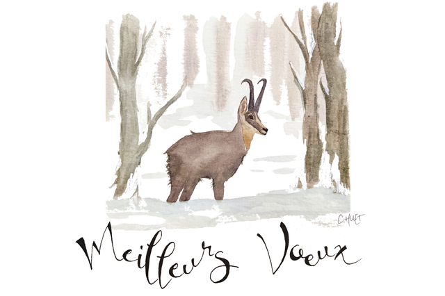 Carte Meilleurs vœux pour les fêtes de fin d'année, illustrations de petites scènes nature : les sapins dans la neige, le renard allongé, le petit oiseau sur sa branche, le chamois dans la forêt.