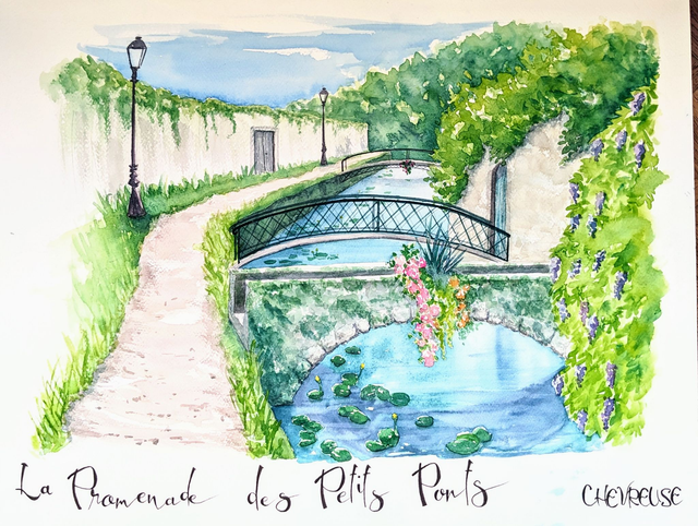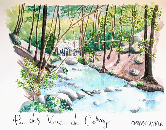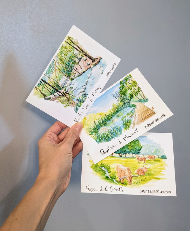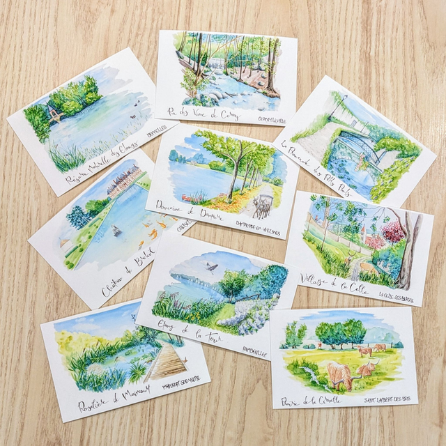 Carte 10*15cm des paysages naturels de la Vallée de Chevreuse, peints à l'aquarelle tel un carnet de voyage local, et reproduits sous format de carte postale.