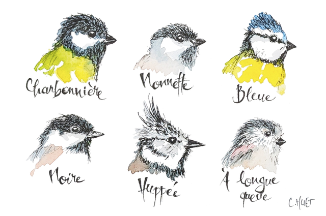 Tableau à l'aquarelle et au stylo fineliner des diverses variétés de mésanges de nos jardins.