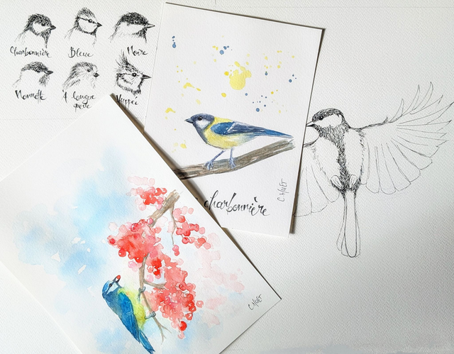 Tableau original à l'aquarelle et fineliner mésanges, 10x15cm environ