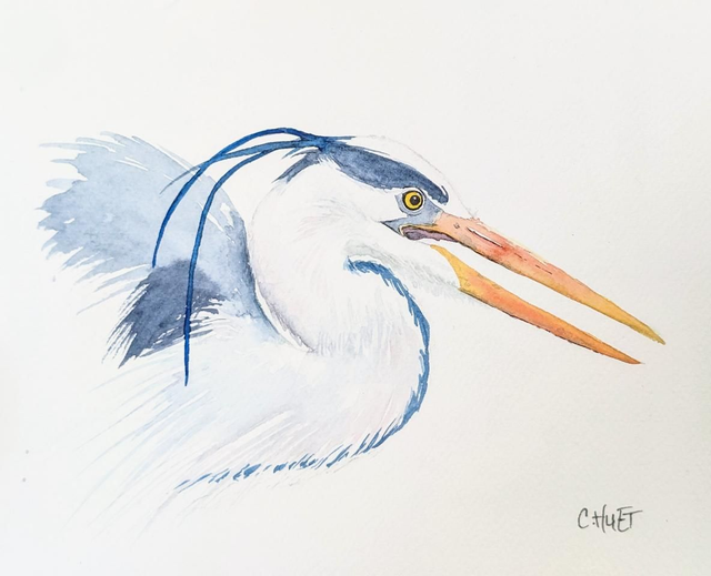 Tableau à l'aquarelle d'un héron cendré vue de près, avec de jolies plumes gris bleuté tout en finesse.