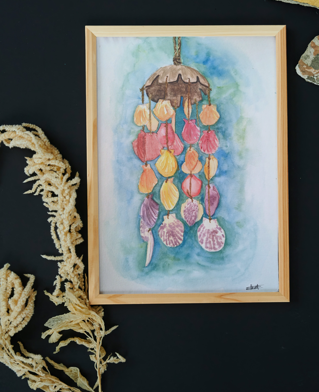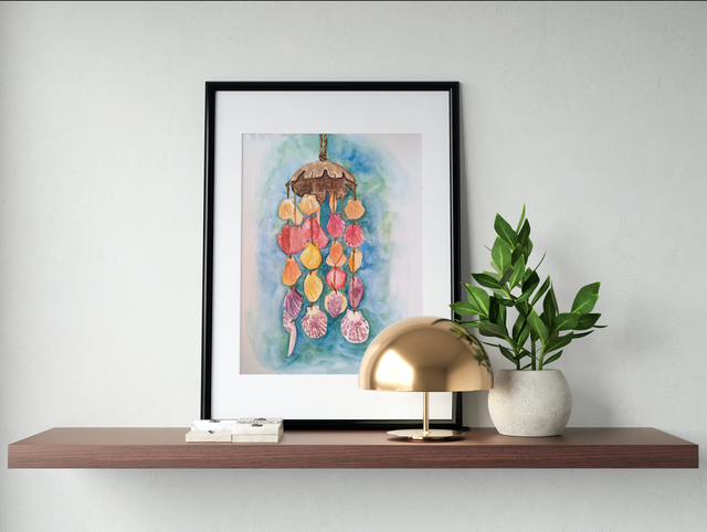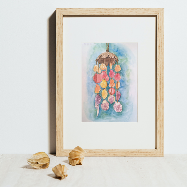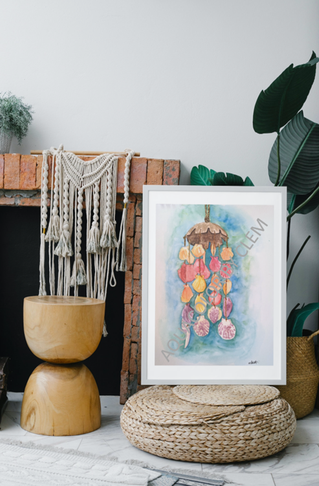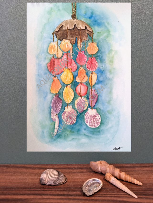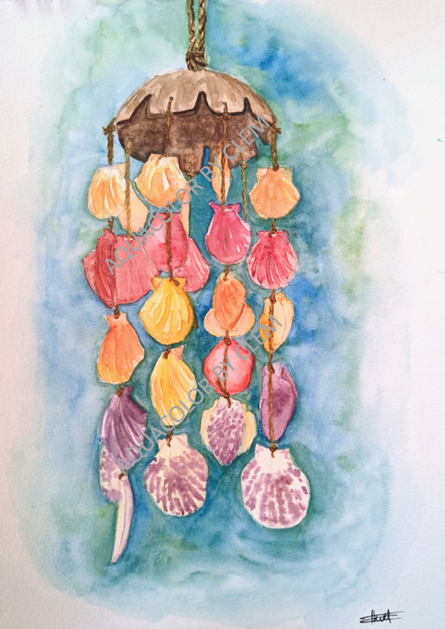 Tableau original à l'aquarelle représentant un mobile de coquillages multicolore, rappelant les séjours en bord de mer dans les pays méditerranéens.