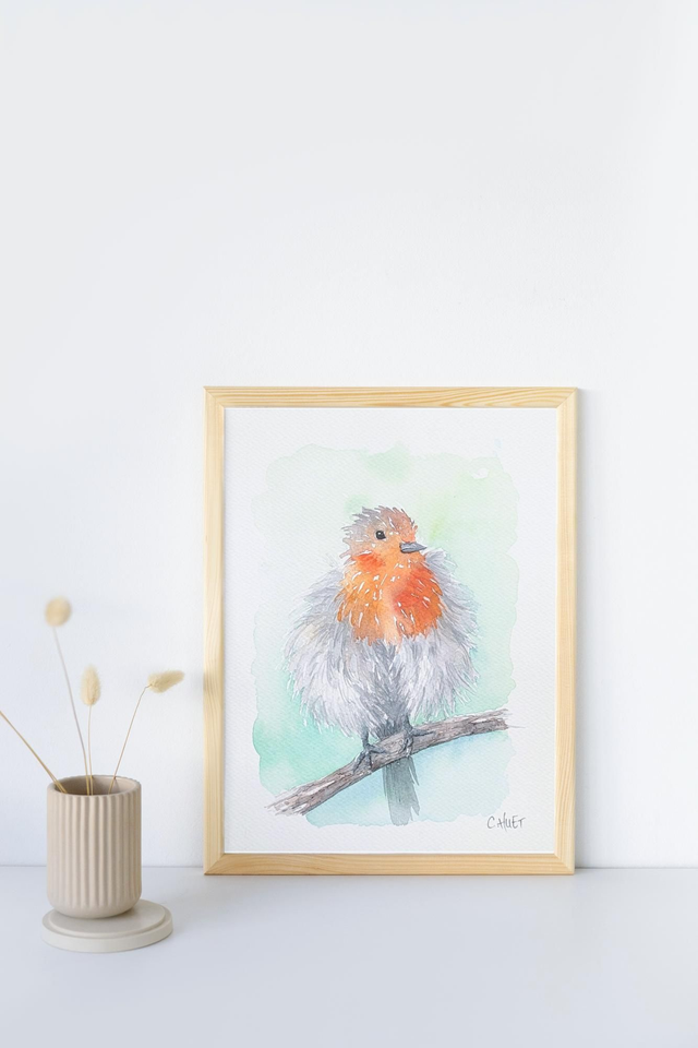 A accrocher seul ou en collection, accompagné d'autres tableaux de rouge-gorges ou oiseaux variés, disponibles dans la boutique !